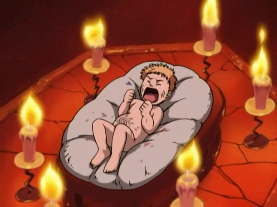 Setelah membunuh para bidan and Anbu, pria bertopeng itu menyandera bayi